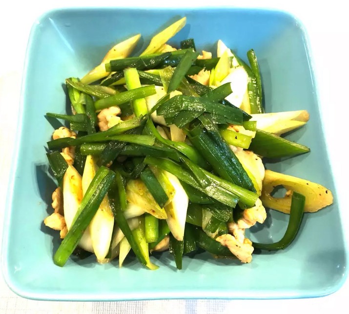 7 ミノに火が通ったら長ネギとニラを入れ炒める。