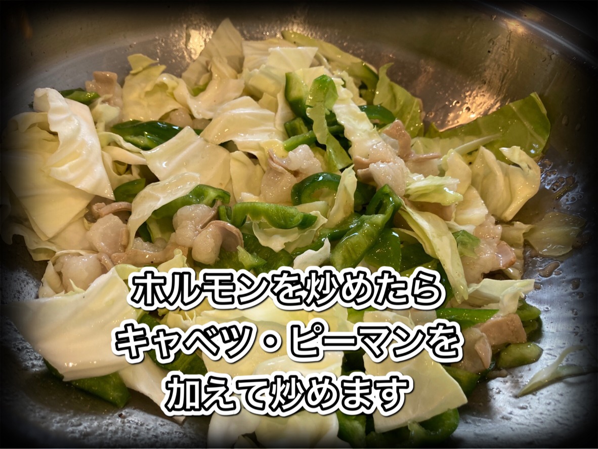 8 ホルモンに焼き色がついたらキャベツ・ピーマンを加えます。
