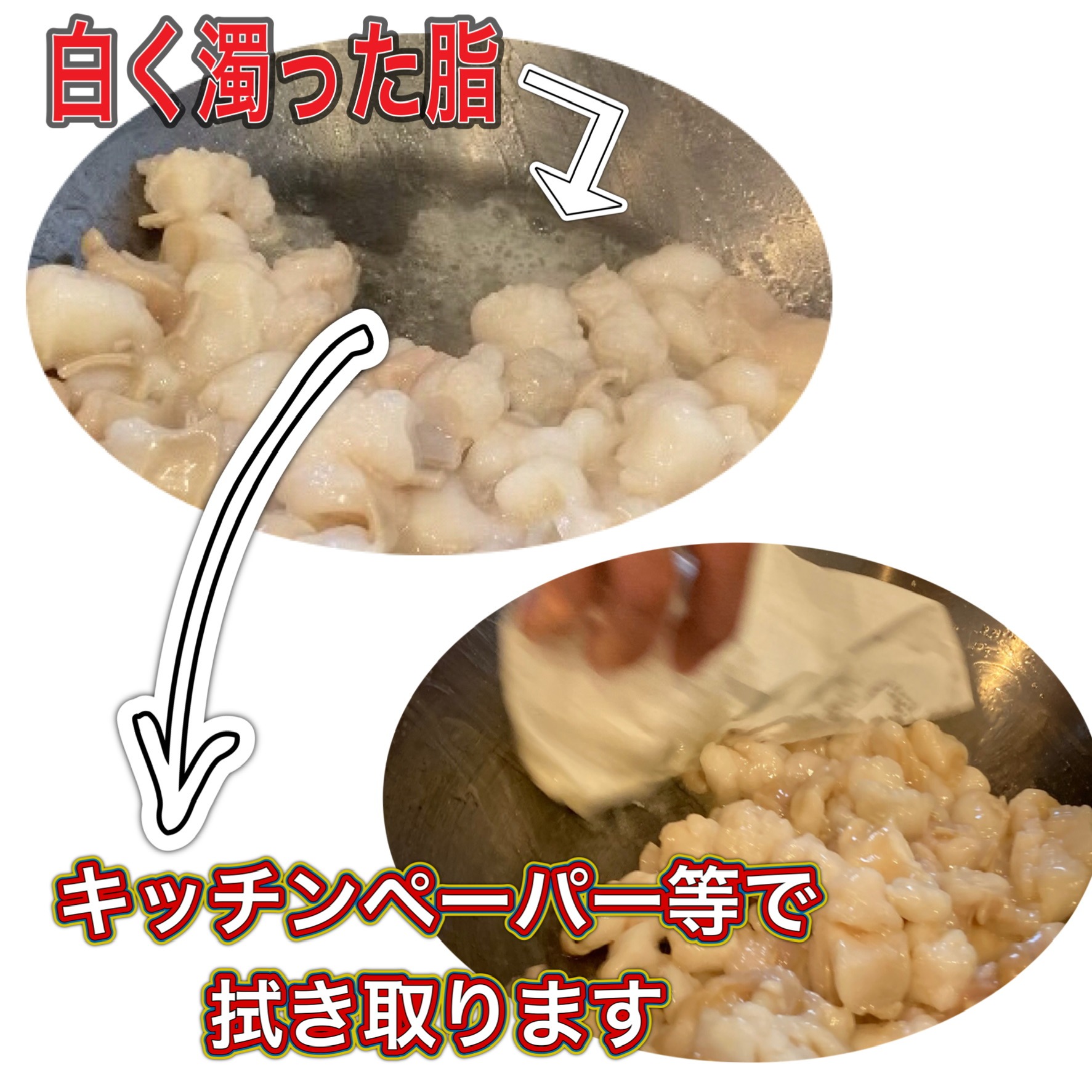 5 炒めると、白く濁った脂が出ますので、キッチンペーパー等でしっかり拭き取っていきます。